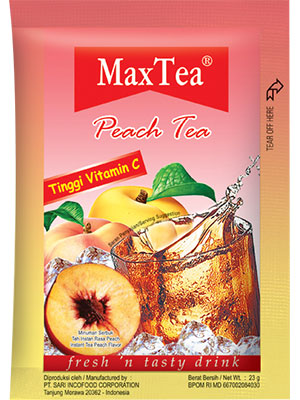 Dengan keahlian dan pengalaman membuat jenis minuman lemon tea, kini MaxTea menyajikan minuman instan Peach Tea yang sama nikmatnya. Perpaduan rasa teh, peach dengan rasa manis yang pas, memberikan kesegaran bila dikonsumsi dingin, atau dikonsumsi hangat memberikan rasa nikmat yang menenangkan.